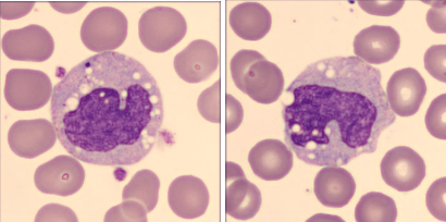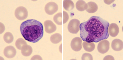 Os monócitos destacam-se por seu tamanho, sendo geralmente maiores que os linfócitos reativos. O núcleo, de formato oval ou reniforme, é frequentemente excêntrico e apresenta cromatina frouxa com uma aparência reticulada distinta. O citoplasma é abundante, de coloração azul-cinza, com vacuolização frequente e a presença de pequenos grânulos azurófilos, conferindo uma aparência finamente granular.